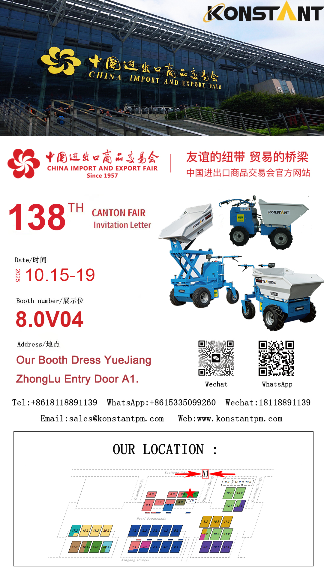 Konnttant, un fabricant de matériel industriel allemand, a été invité à participer à la foire de Canton de cette année et a créé un stand dédié au stand 8.0v04 dans le hall 8. Le stand est situé à la robe Entrée de la route moyenne Yuejiang du côté A1 de l'entrée du salon. Une signalisation claire sur place et une carte dédiée sont fournies pour une navigation facile.